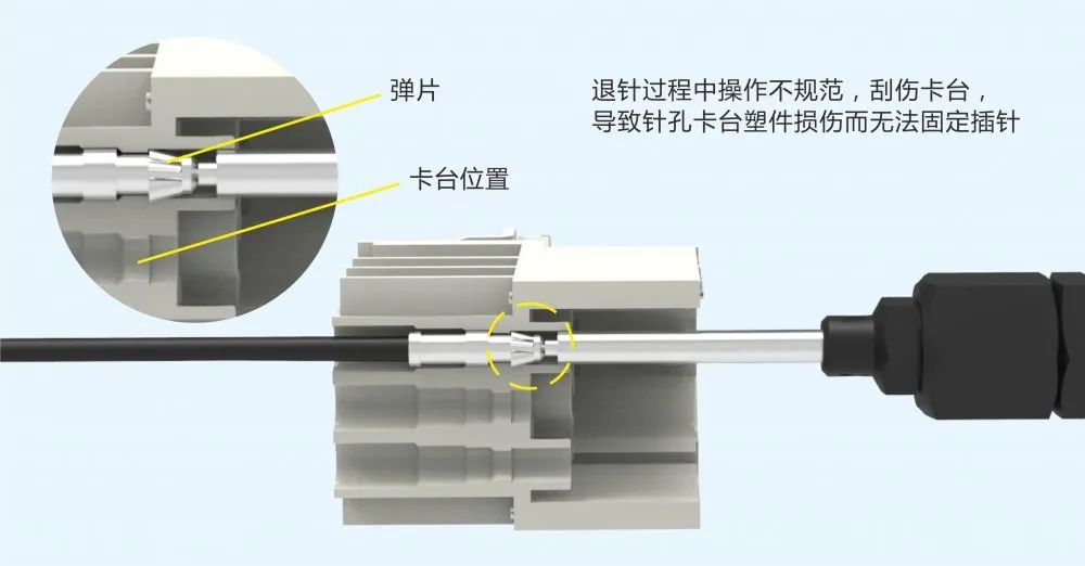 退針過程中操作不規范,刮傷卡臺,導致針孔卡臺塑件損傷而無法固定插針。
