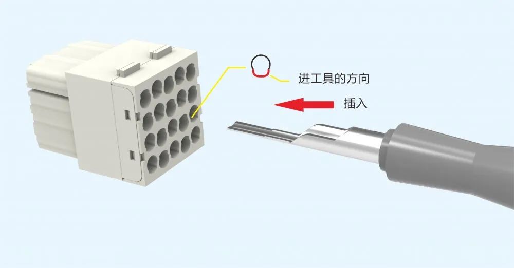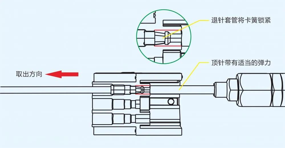退針時先將工具從插合端裝針孔垂直插入,并從裝針端拽拉導線,即可取出插針。