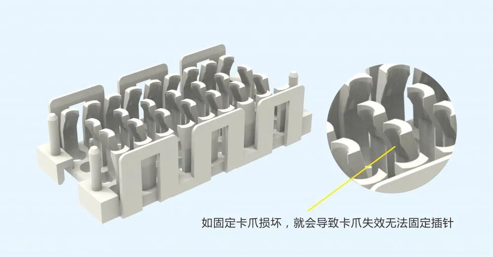 操作不規范,將插針孔固定卡爪破壞變形損傷,導致卡爪失效無法固定插針。